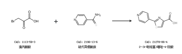 2.通過(guò)溴丙酮酸和硫代異煙酰胺合成2-(4-吡啶基)噻唑-4-羧酸