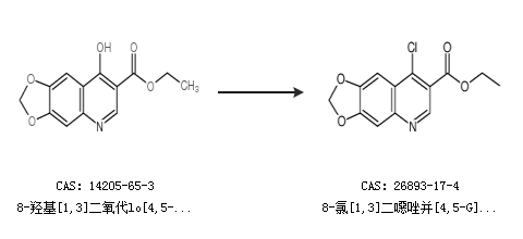 1.通過(guò)8-羥基[1,3]二氧代lo[4,5-g]喹啉-7-羧酸乙酯合成8-氯[1,3]二噁唑并[4,5-G]喹啉-7-甲酸乙酯