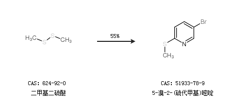 2.通過(guò)二甲基二硫醚合成5-溴-2-(硫代甲基)嘧啶,收率約55%;
