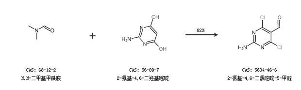 2.通過2-氨基-4,6-二羥基嘧啶和N,N-二甲基甲酰胺合成2-氨基-4,6-二氯嘧啶-5-甲醛,收率約82%;