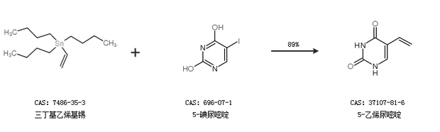 1.通過三丁基乙烯基錫和5-碘尿嘧啶合成5-乙烯尿嘧啶,收率約89%;